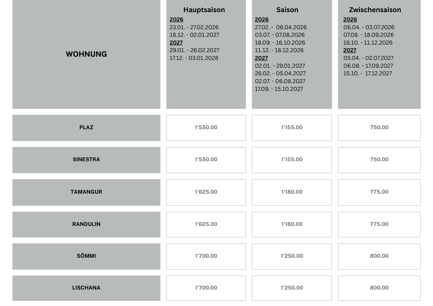 Wir weisen Wochenpreise in CHF inkl. Mehrwertsteuer aus. Im Preis inklusive: Bett-, Bad-, Küchenwäsche. Die Endreinigung und Kurtaxen bezahlen Sie extra. Für die Endreinigung verrechnen wir CHF 180.00 pro Wohnung.