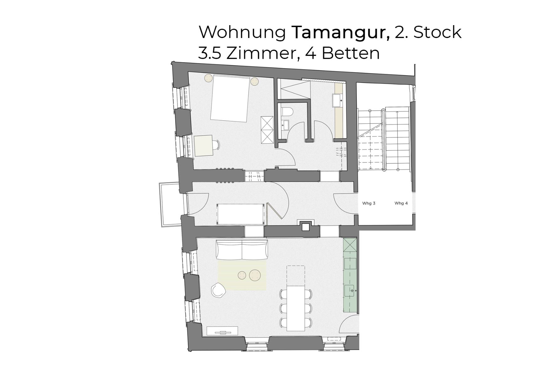 3,5 Zimmer Wohnung, 76 m2, 2. Etage, 4 Betten